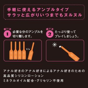 みんな〜!ア○ルがだいすきな人にオススメのシリコンローションがあるんだよ!こだわりの品質で、液垂れしなくてすんごくスムーズ〜。少しでだいぶ潤滑できるし、グリセリンも使ってないから安心〜。日本製で安全だよ。アンプル5本入りだし、1回きりだからいつでも清潔に使えるんだよ〜。先端が柔らかくて細いので、直接使う人も大丈夫だよ〜。