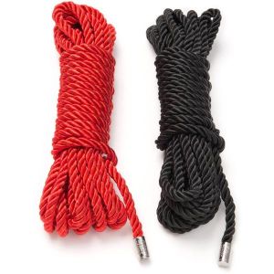 えっと、このアイテム、2本入っていて、どちらも5メートルのサテン束縛ロープなんだ。エンドキャップ部分には、ロゴが入っているから、オシャレで洒落てるよ!