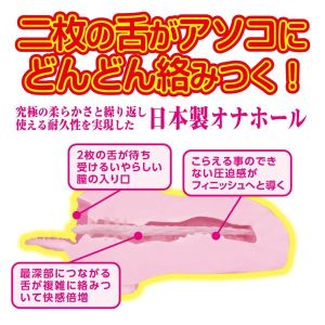 そして、このオナホール、なんと新開発の2枚の舌が絡みついて、快感が倍増するんだって!どんな形かと言うと、とても特殊な形状で、床に固定できますっ!これなら、手が自由になるから、イッた後も続けられちゃいますね!ちなみに、オナホールは日本製で、軽いから持ち運びが簡単ですよ!