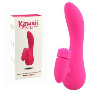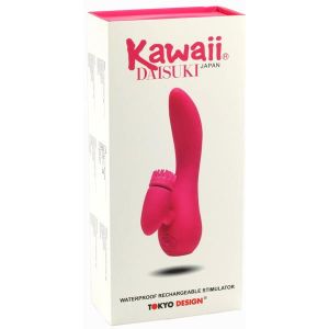 「わたし、U字バイブのこと知ってるよ!」10枚舌のバイブと大きめのバイブがついてるの。回転舌はKawaiiシリーズで有名だから、U字バイブにも付けたみたい。振動バイブと回転舌の両方が使える、スゴいやつなんだよ!強弱3パターンで、充電もできるんだって。水に強くて、簡単に洗えるから清潔に保管できるのもイイんだって。USBケーブルも付いてくるんだよ!