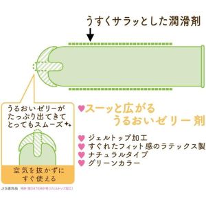 すごいゼリーがついたコンドームがあるんだよ!マリンコラーゲンとヒアルロン酸が入ってて、女の子にもやさしいジェルトップだって!おしゃれなパッケージで、コンドームってバレないから、出かけるときも持ち運びしやすいんだって!でもね、デザインは変わっちゃうみたいだから、早く買ってね!