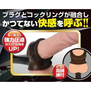 すごーい!男らしさって最高だね!プラグとコックリングがくっついて、すごい気持ちいいの!竿と睾丸が同時に締め付けられて、ものすごく持続力もあがって、射精感もすごい上がるんだよ!それに、ウイング型のプラグが前立腺を刺激するから、3点攻撃でお兄さんはめっちゃ気持ちいいんだって!ね、すごいでしょ!