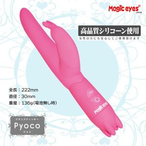 みんな〜、Pyocoちゃんって知ってる?ウサ耳が可愛いスティックバイブだよ!それぞれの方に合った3cmの先端で初心者だって使いやすいんだ。全長は22cmで手が届くミドルサイズよ!2本のウサ耳型クリバイブでプルプル責められちゃうわ〜。振動が強いけど静音!静かな場所でもご使用出来るもん。10種類のプログラムモードがあるからお好みのシチュエーションで使い分けて楽しめちゃう!女性にも安心なシリコーン素材を使ってるからお手入れも簡単!単4電池2本使うからバッテリーも長持ちだよ。ちゃんと言っておくけど、このPyocoちゃんはジョークグッズだからそれ以外の目的で使うのはダメだよ〜。