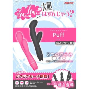 「クチュスティッキーシリーズに、新しいお友達の「Puff」が仲間入りしたの!タマゴみたいにポンポン膨らんだ可愛いスティックバイブなの♪10種類のバイブレーションモードで初心者から上級者まで楽しめるよ!弾力もあるからキュンキュン感が先っぽまで伝わっちゃうかもしれないよ!静かだし、ゴム臭いがしないシリコーンゴム素材を使っているから安心して使えちゃうの!水にも強くて、メンテナンスも簡単なんだって♪単4電池2本使うよ!」