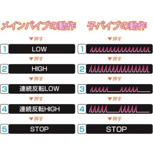 Gスポットをピンポイントで攻撃するヘッドが付いてて、いっぱい気持ちいい刺激が待ってる!それにさ、メインバイブには5種類ものパターンがあるから、好きなのを選んでシャワーみたいにオルガスムしてね!クリバイブも強力で、快感の頂点が目の前!うふふ、すごくいい感じだよ!