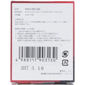 ねぇねぇ!すごーい、新しいおやつみつけた!植物っぽいやつ!んで、原材料みたら、ソフォンエキス、ムイラプアマエキス、トンカットアリエキスって書いてある!なんかすごく体に良さそう!小さいボトルに0.5mlが4本入ってるから、持ち運びにもいい!試してみようっと!