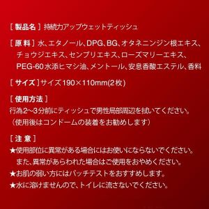 いつもより長く頑張りたい時に使える男性用ウェットシート!亀頭を中心にサッとひと拭きで持久力アップ!コンパクトで持ち運びに便利なノンケミカル成分の天然植物配合!1箱に2枚入ってるよ!使ったらコンドームをつけようね!男のマストアイテム!