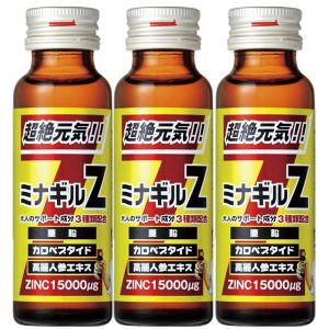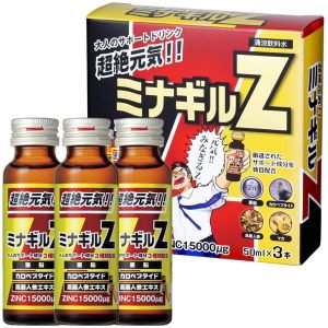 「ミナギルZ 50ml×3本セット」はおとなのみんなのために作られたお飲み物だよ!亜鉛とかオットセイのものとか、動物や植物の栄養素までいろいろなものが入っているんだ。1500ugの亜鉛が入ってるよ!自分に自信が持てない人や、若々しくいたい人、ちょっとお悩みの人にぴったりだね。3本セットでお得だよ。大人の男女の力強い毎日をサポートするよ!