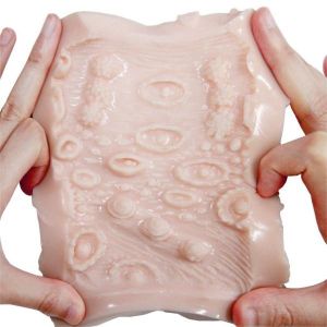 新しいオナホがあるよ!医療用ゴムで作られてるから、食べ物用のルールにも合ってるんだって。外側は硬くて中は柔らかい医療用ゴムでできてて、独自のやり方で一緒になってるんだって。中にヒダがたくさんあって、手で締めつけられるように固めてるから、感じがすごくいいの!匂いやベタつきもなくて、日本で作られた特別なオナホだよ♪