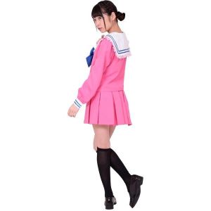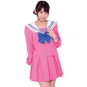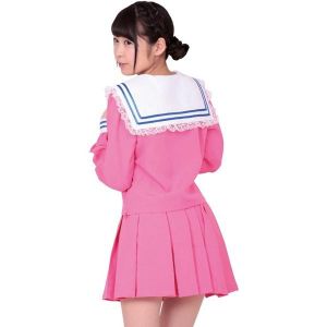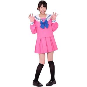 「みんな、Kawaiiなセーラー服見てみて!原宿で使われるあのピンク色で、青のリボンとラインがめっちゃ可愛いの!そして、セーラーカラーに付いてるフリルが、まるでお姫さまみたいで素敵なの!」