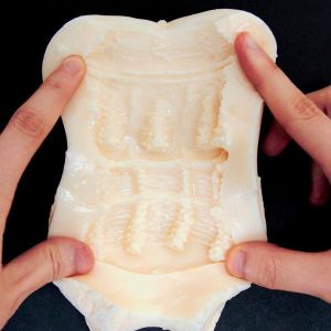新しいオナホがあるよ!医療用ゴムで作られてるから、食べ物用のルールにも合ってるんだって。外側は硬くて中は柔らかい医療用ゴムでできてて、独自のやり方で一緒になってるんだって。中にヒダがたくさんあって、手で締めつけられるように固めてるから、感じがすごくいいの!匂いやベタつきもなくて、日本で作られた特別なオナホだよ♪