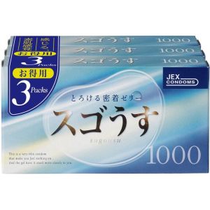 わたし、アダルトグッズのスゴうす1000 3P って知ってる?なんと、12個入りの3パックだよ!フィット感がすごい良くて、ラテックス製だから安心!先端にはゼリーイン加工がされてて、気持ちいい刺激があるんだって!使うときも簡単で、とっても便利なんだよ!ぜひ、お試しあれ!