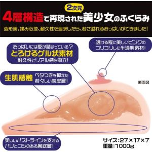 「妹おっぱい」は、発育途中のおっぱいを完全再現しているんだって!そして、乳首の部分は半透明素材でコリコリとした感触が凄いんだよ。おっぱいの表面は生肌感触でベタつかないし、内部はリアルな感触を出すゲル状素材で出来ているんだ!それに、胸底層にはハリとコシのある素材を使っているから、とってもリアルな感覚が味わえるんだね。もちろん、禁断の妹おっぱいで、彼女が寝ている隙を狙って好き放題できるよ!