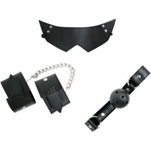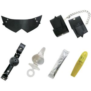 まずは、視覚を奪って支配感を高めるアイマスク(目隠し)が入っているよ。それに、羞恥な見た目で大定番の口枷(ボールギャグ)もセットになっているんだ。そして、拘束させて自由を奪う手枷(ハンドカフス)も入っているよ。