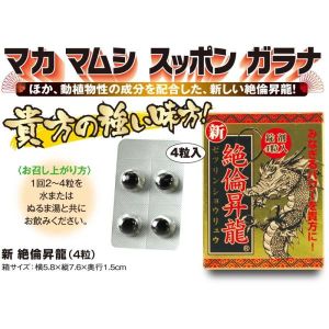 ねえねえ、聞いて聞いて!「新 絶倫昇竜 4粒」ってアダルトグッズなのよ。でも、ね、この商品は貴方の味方として、マカやマムシ、スッポン、ガラナなどの成分を配合しているんだって!動植物性とか、すごいよね。