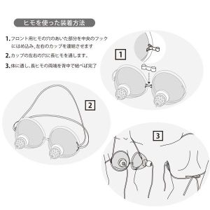 注意点だけど、以前のモデルとはジャックの極性が違うからね。他のジャックタイプの対応グッズと繋げて動かなかったら、別途【極性変換ケーブル】(別売り)を使ってね。カップと肌の接地箇所にはシリコン素材が使われているから、シリコンローションは避けて、【ニップルドームローション】【ニップルアタッチメント専用ローション 60フルタイム】みたいな水溶性ローションを使ってね。フロント用のヒモは小さなパーツなのでなくさないように気をつけてね。セットしにくい時は、先の細いドライバーを使うと簡単にできるよ。