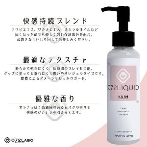 男の人用の潤滑液だよ!気持ちよくなったら逃したくなくなるんだよね~。長く続くから大切なアレに傷つかないようにも守ってくれるんだ。早くシコシコすると皮が痛くなっちゃうけど、これなら心配いらないよ!スッポンエキスが入っているからビンビンできるし、匂いも気持ちいいんだって~♪ 072リキッドっていうジェルリキッドは自分で遊ぶときも、彼氏と遊ぶときも使えるんだよ!たくさんの海洋のものが入ってるからデリケートなところも保護してくれるんだ。ぜひ使って見てね!
