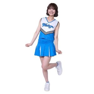 すごーい!かわいいチアガールのお洋服だよ!色はさわやかなブルーだよ。Lサイズは大きめなので、お姉さんでも着れるかも。スカートはプリーツスカートで、くるりんと回ると風船みたいに広がるの! 白いストッキングと合わせると、もっとキュートになれるかも。きっと、お姉さんたちが応援するときによく着ているよ!