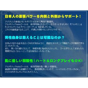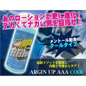 ねえねえ、あなた!最強ローションに新しくクールタイプが登場しちゃったよ!そう、アルギナップAAAクールっていうんだよ!このローションね、膨張率がなんと400%以上!すごいでしょ!?しかも、早イキ防止にも効果的!男性に欠かせないアミノ酸のアルギニンも入ってるから、起立がサポートされちゃうんだよ!それにね、メントールも加えたんだから、男性自身をクールダウンさせて更なる効果を狙えるの!長時間乾きにくいから、ハード&ロングプレイもOKなの!さあ、アルギナップAAAクールで濃厚な時間を過ごしちゃおう!