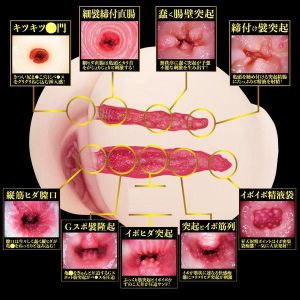 「すごーい!今までにない感じでびっくりしちゃう!すごく気持ちイイ名器だよ!重さは5.4キロもあるんだけど、ヴァギナとアナルの二重構造でとっても肉厚感があるの!上の角度を変えると、色んなポーズができるんだよ!ヴァギナは亀頭・カリ首・竿の刺激がすごいし、アナルも圧力感と征服感があって最高!国産の最高峰ホールだから、絶対楽しめるよ!」(予想)