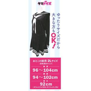 ねえねえ!お兄ちゃんもお姉ちゃんも、セーラー服が好きなら、これ見て!シックなブラックの長袖セーラー服タイプのパジャマだよ!キラキラ光ってる素材なんだけど、柔らかくって肌に優しいよ。ピチピチ感じないから、大きい人も大丈夫!リラックスタイムにぴったりなんだよ。あ、お兄ちゃん用の3Lサイズ(男性用Mサイズ)だよ。胸囲96~104cm、胴囲94~102cm、着丈92cmだよ。ポリステルとポリウレタンでできてるんだ!