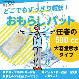 「おもらしパット」っていうのは、おしっこの仕方ができなくなっても安心できるアイテムなんだよ♪500ccまで吸収できて、ズレ止めテープもついているからいつでもどこでも使えるんだ。ボックスやトランクスに貼り付けて下着のセットも簡単。COOLPさんは、ストレス社会では大胆な気持ちが必要だって言ってるんだ。使い方は簡単! パットを開いて、ズレ止めテープを剥がして、下着に貼り付けて、使用後は抗菌・消臭袋に入れて捨てるんだ♪