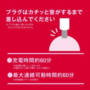 お手入れも簡単!防水設計で、放水ノズルを使って噴流水を最低3分間あてる試験をクリアしているからね。充電時間は約60分だよ。それから、最大連続稼働時間も約60分だよ。