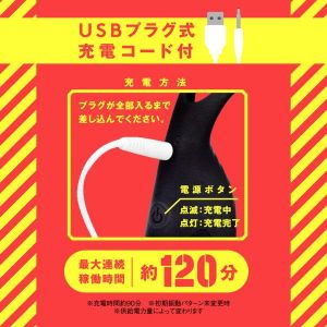 あ、そうそう、充電式だからエコなんだって!充電時間は約90分で、最大連続稼働時間は約120分(初期振動パターン未変更時)だからね!リモコンもUSBプラグ式充電コードもついてくるよ!