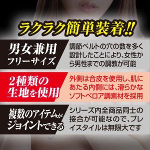 この口枷のいいところは、男女問わず使えるってこと!調節ベルトの穴が通常より多く設置されてるから、女のコでも男のコでも使いやすいの♪あと、外側は合皮、内側は優しいベロア調の生地を使ってるから、快適に使えるのもGood!!