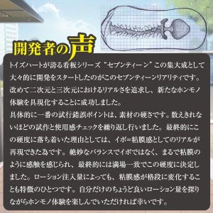 「セブンティーン リアリティ」は、サラサラでほぼ無臭である特徴があり、耐久性も高めで裏返し洗いができるため使い勝手がよいです。内部は狭く、細かなツブツブ(粘膜)に包まれるため、ノック感を味わうことができます。さらに、バキューム力が強く、ローション量を多めにすることで長く持続するため、ローションを多めに使用することがオススメです。入口付近は狭く、奥はゆったりとしており、奥にある子宮口で擦ると気持ちいいです。しかし、使用していると奥の空間のせいで抵抗が生じる場面があるため、改良版を希望する声もあります。ただし、挿入したときの感触はよく、においも気にならないため、一度は試してみる価値があります。短いという声もありますが、リアルさと締め付け具合、刺激が強く、イケなかった人でも、イクことができたため、おすすめです。
