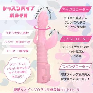 ポ○チオ&ク○イキのダブル悶絶レッスン!やわらかエラストマー素材で初心者も安心。つぶつぶと3本の触覚でク○歓喜!振動とスイングは、2つのコントローラで個別に操作可能。即イキの組み合わせが見つかる無段階スライド!全長215mm×太さ26~38mmで175g。付属品は単4マンガン電池×4本。注意事項として、安全に利用するために単4アルカリ電池×4本を別途購入が必要です。