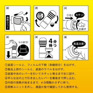 『QUICK WARMER』っていう新しいシステムがあるんだって。底面の保護シールとか、シュリンクフィルム、アルミフィルム、エアホールシールをはがして、底面中央のレバーを引いて、「カチッ」と鳴るまで回すんだよ。そしたら、4分間待って、発熱ユニットができるんだって!