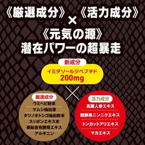 さらに、マムシ抽出液やタツノオトシゴ抽出粉末、スッポンエキス末、亜鉛含有酵母エキス、アルギニンといった厳選成分を組み合わせて配合しているの。そして、みなぎる活力成分として「高麗人参エキス、醗酵黒ニンニクエキス、トンカットアリエキス、マカエキス」も入っているのよ。