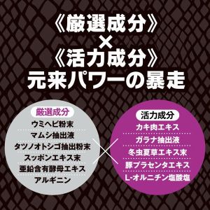 これだけでもすごいけど、さらにカキ肉エキス、ガラナ抽出液、冬虫夏草エキス末、豚プラセンタエキス、L-オルニチン塩酸塩なども組み合わせているから、ぜんぶ合わさってめっちゃパワーが出るんだ!
