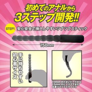 では、早速3つのステップの説明をしましょう。まず、STEP1は全長150mmで先端部の径が10mmのつぶつぶスティックです。初めての人でも挿しやすい大きさで、柔らかくて弾力のある素材を使っているから、痛みや違和感を感じずに使えるのがいいところです。