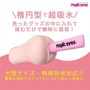 これ、大きめのグッズでも対応できるから、心配いらないんだよね。グッズに挿れて揉んで、水分を吸わせるんだって。そして、優しく水分を絞って、日陰で乾かして完成!