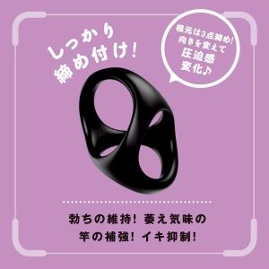 すごーい!新しいリングが出たよ!根元とタマタマに装着できるんだって!根元を3点で締め付けて、タマタマもしっかり締め付けて力を出せるよ!装着も簡単だし、伸縮性があって臭いもしないシリコンでできてるからストレスもないの!毛も巻き込まれないし、自分の好みに合わせて締め付けも調整できるよ!竿も補強されて、いっぱい出る感じもアップするんだって!