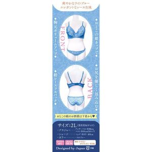 サイズは2Lサイズ(男性用Mサイズ)で、ブラはアンダーバスト約80cm、バスト約93cm、カップはBカップでホックは2段3列、ワイヤーも入っているんだ。ショーツはヒップが約97~約105cmで、カラーはライトブルーだよ。素材はナイロンやポリウレタン、その他も使われているんだ。