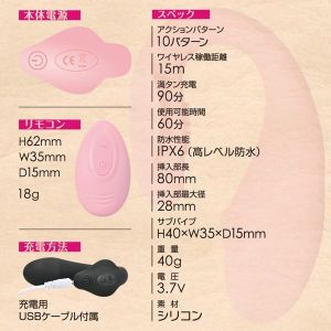 Gとソト、どっちも同時いたずらできるシリコンワイヤレスおもちゃ!中と外を挟んだサンドウィッチスタイルでWモーターが入ってるよ!10種類のバイブが最高15メートルまで遠隔操作できるの!ローターはシリコン素材で水にも強くて洗っても大丈夫だよ。そして静かな振動だから周りを気にせず楽しめるんだよ。充電は90分で最大60分遊べるよ!