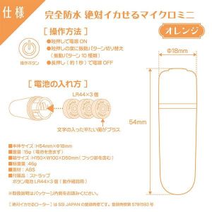 ねぇ、お友達〜!絶対イカせるマイクロミニオレンジ、気になったでしょ〜?まずはパッケージの台紙の裏に書いてある説明をしっかり読んでね。ローターには丸い絶縁紙がついてるけど、使う前には外してね〜!このローターは、SSI JAPANの登録商標「絶対イカせるローター」なんだよ〜!だから、本物のパワーを堪能してみてね〜!