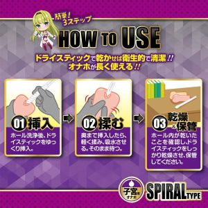 使い方も超簡単だよ! ホールを使った後は、ゆっくりドライスティックを奥まで挿入して、ホールごと軽く揉んで吸水させるんだ。その後、ホール内が乾燥したことを確認したら、ドライスティックもしっかり乾燥させて保管しようね!