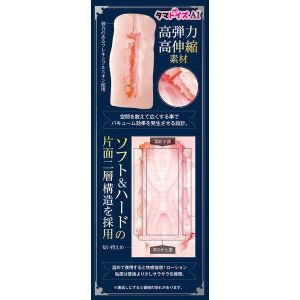 すごーい!国内で作られたオナホールなんだって!AIが考えた内部構造で、下の方が2層になってるんだよ。上はやわらかくて、下はしっかりとしてるよ。すごいでしょ?空間も広くなってて、バキューム効果があるんだって。触ってみたら弾力のあるフレキシブルな素材でできてて、伸びたりするよ。ニオイも少ないし、全部詰まってないから安心だよ。ローションもついてて、長さ160mmで重さ450gだから持ちやすいよ。