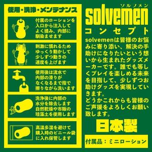 「ソルブメン」っていうすごいやつが、お悩みを解決してくれるんだって!「とにかくせまい」っていうお悩みがある人向けの、提案型お悩み解決ホールなんだって。素材は柔らかすぎず、固すぎずで、バランスがいいものになっているの。ねじれヒダ+狭さ+刺激がすごくいい感じで、毎日楽しめるって言うの!オナホ選びに悩む必要がなくなりますよ。日本製だから安心して何度でも使えます。