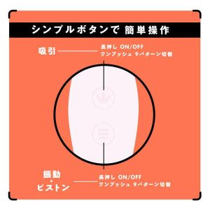 動:1つ。超気持ちいい吸い込みピストンバイブで、イキまくり!防水でお手入れもカンタン。愛情たっぷりの肌に優しいソフトシリコン素材。自分好みの角度でぷにっと曲げれるから、快感倍増!吸引は9パターン、振動は1つ。2WAYイキで、最高の天国を味わえるよ!