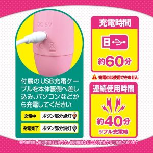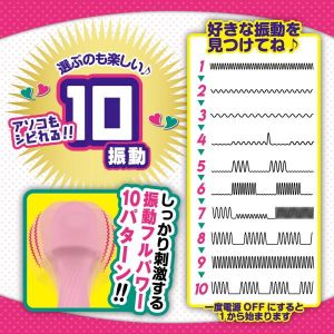 ねぇねぇ!これ触ってみて!手触りがいいでんまーだよ!振動は10パターンあるからいつでも新鮮だよ!頭も42ミリでぴったりフィットするよ♪曲がったりもするんだよ!経済的で充電式だからうれしいね!やり方は、電源のボタン3秒長押しでつくれるんだよ!+ボタンや電源のボタンを押したらバイブが変わったり戻ったりするよ!充電の仕方は、小さいクボミの下にあるプラグを挿せばOK!付属品にケーブルもあるよ!