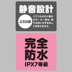 そしてもう1つ、完全防水でIPX7等級だから、お風呂でもお風呂でも使えるんだ!そして、静かな設計だから、音が50dB以下で、静かに使えるよ!