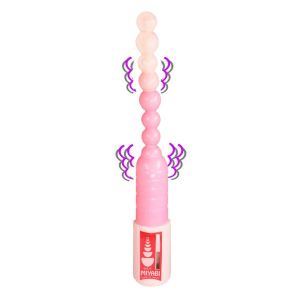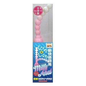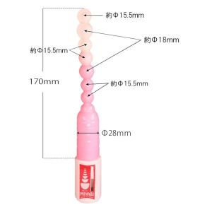 「ハイ、みんな!今日の新作グッズは、電動ミルフィーアナル ピンクだよ!アナルバイブの中でも、スマートなフォルムで細くて挿入しやすいよ。110ミリのロングさで、ねじれ具合も自由自在!上にパール玉が付いていて、バイブを挿入する時に感じるエッチなプレイがさらにアップしちゃうんだ♪パール玉の直径は、15.5mmから18mmくらいで、ランダムに並んでいるから、柔らかいカバーで安心して遊べるっていいよね!」