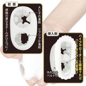 やっべ~!も、もうすぐ彼氏とデートだけど、最近イってばっかりでちょっと自信ないなぁ・・・。そんなときに必要なのが「リアルペニストレーナー ホワイトアウト」だよ! これで手コキを練習して、強い男になれるかも・・・! 2穴タイプで、大きいホールと小さいホールがあるから、トレーニングのレベルに合う方を選べるの! しかも、玉かけキーパーに引っ掛けて使うことで、しっかりと掴まれるから安定してトレーニングできるよ! そこにおすすめの小型バイブやローター(別売)をつけると、振動をプラスできるから、もっと刺激的にトレーニングできちゃう! もう、女の子たちがうらやむ、上を目指す男になっちゃおう!