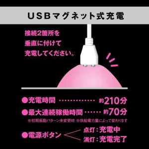 あと、このおもちゃは充電式だから環境にやさしく使えるの♪充電時間は約210分で、最大連続稼働時間は約70分だよ。あ、ちなみに予定されている振動パターン以外は、稼働時間がもっと長くなるから注意してね♪本体は生活防水仕様だから、お風呂でも使えるよ♪付属品にはアタッチメントや充電用プラグ式コードがついてくるから安心だよ♪