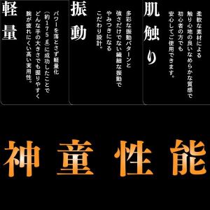 神童デンマは、小さい手でも握りやすくて疲れにくい約175gの軽さがあるんだよ。振動もいろんなパターンがあり、繊細な振動でとっても気持ちいいから、やみつきになっちゃうよ。そして触り心地がいいので、初めての人でも安心して使えるんだ。360度ヘッドが柔軟だから、いろんなプレイが自由にできるんだ。検査番号は、2002949だよ。